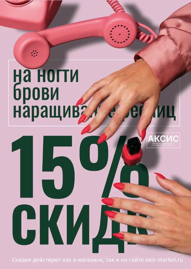 15% скидка каждое 15-е число месяца: брови, наращивание ресниц, ногти