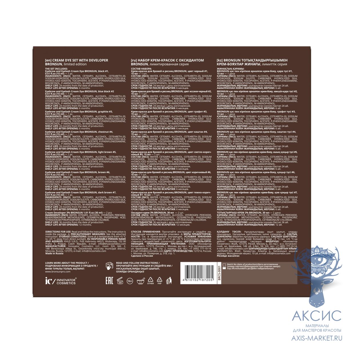 Крем-краска для бровей и ресниц BRONSUN, цвет черный #1, 15 мл. СОСТАВ: Water, Сetearyl Alcohol, Сeteareth-20, Sodium Hydroxide, Sodium Sulfite, Carbomer, Hydrolyzed Silk, Hydrolyzed Keratin, Tocopheryl Acetate, P-Phenylenediamine, Resorcinol, p-Aminophenol, m-Aminophenol. Крем-краска для бровей и ресниц BRONSUN, цвет иссиня-черный #2, 15 мл. СОСТАВ: Water, Сetearyl Alcohol, Сeteareth-20, Sodium Hydroxide, Sodium Sulfite, Carbomer, Hydrolyzed Silk, Hydrolyzed Keratin, Tocopheryl Acetate, P-Phenylenediamine, Resorcinol, p-Aminophenol, m-Aminophenol. Крем-краска для бровей и ресниц BRONSUN, цвет графит #3, 15 мл. СОСТАВ: Water, Сetearyl Alcohol, Сeteareth-20, Sodium Hydroxide, Sodium Sulfite, Carbomer, Hydrolyzed Silk, Hydrolyzed Keratin, Tocopheryl Acetate, P-Phenylenediamine, Resorcinol, p-Aminophenol, m-Aminophenol. Крем-краска для бровей и ресниц BRONSUN, цвет каштан #4, 15 мл. СОСТАВ: Water, Сetearyl Alcohol, Сeteareth-20, Sodium Hydroxide, Sodium Sulfite, Carbomer, Hydrolyzed Silk, Hydrolyzed Keratin, Tocopheryl Acetate, P-Phenylenediamine, Resorcinol, p-Aminophenol, m-Aminophenol. Крем-краска для бровей и ресниц BRONSUN, цвет светло-коричневый #5, 15 мл. СОСТАВ: Water, Сetearyl Alcohol, Сeteareth-20, Sodium Hydroxide, Sodium Sulfite, Carbomer, Hydrolyzed Silk, Hydrolyzed Keratin, Tocopheryl Acetate, P-Phenylenediamine, Resorcinol, p-Aminophenol, m-Aminophenol. Крем-краска для бровей и ресниц BRONSUN, цвет коричневый #6, 15 мл. СОСТАВ: Water, Сetearyl Alcohol, Сeteareth-20, Sodium Hydroxide, Sodium Sulfite, Carbomer, Hydrolyzed Silk, Hydrolyzed Keratin, Tocopheryl Acetate, P-Phenylenediamine, Resorcinol, p-Aminophenol, m-Aminophenol. Крем-краска для бровей и ресниц BRONSUN, цвет темно-коричневый #7, 15 мл. СОСТАВ: Water, Сetearyl Alcohol, Сeteareth-20, Sodium Hydroxide, Sodium Sulfite, Carbomer, Hydrolyzed Silk, Hydrolyzed Keratin, Tocopheryl Acetate, P-Phenylenediamine, Resorcinol, p-Aminophenol, m-Aminophenol. Оксидант-крем 3% BRONSUN, 30 мл. СОСТАВ: Water, Cetearyl Alcohol, Hydrogen Peroxide, Behentrimonium Methosulfate, Ceteareth-20, Phosphoric acid, Tetrasodium Pyrophosphate, Cetrimonium Chloride.