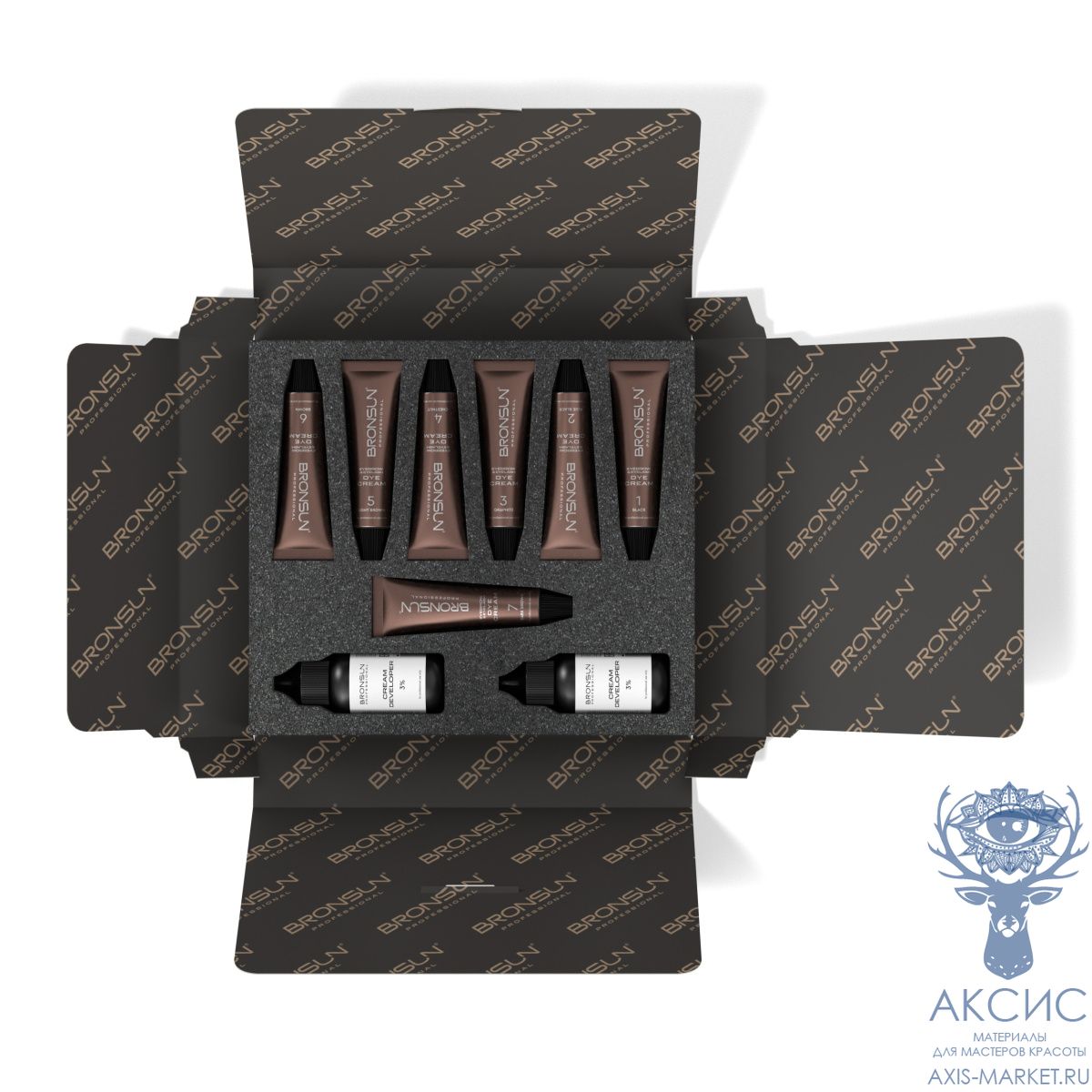 - Комплектация: Крем-краска для бровей и ресниц BRONSUN, цвет черный #1, 15 мл — 1 шт.; Крем-краска для бровей и ресниц BRONSUN, цвет иссиня-черный #2, 15 мл — 1 шт.; Крем-краска для бровей и ресниц BRONSUN, цвет графит #3, 15 мл — 1 шт.; Крем-краска для бровей и ресниц BRONSUN, цвет каштан #4, 15 мл — 1 шт.; Крем-краска для бровей и ресниц BRONSUN, цвет светло-коричневый #5, 15 мл — 1 шт.; Крем-краска для бровей и ресниц BRONSUN, цвет коричневый #6, 15 мл — 1 шт.; Крем-краска для бровей и ресниц BRONSUN, цвет темно-коричневый #7, 15 мл — 1 шт.; Оксидант-крем 3% BRONSUN, 30 мл — 2 шт.; Инструкция — 1 шт.