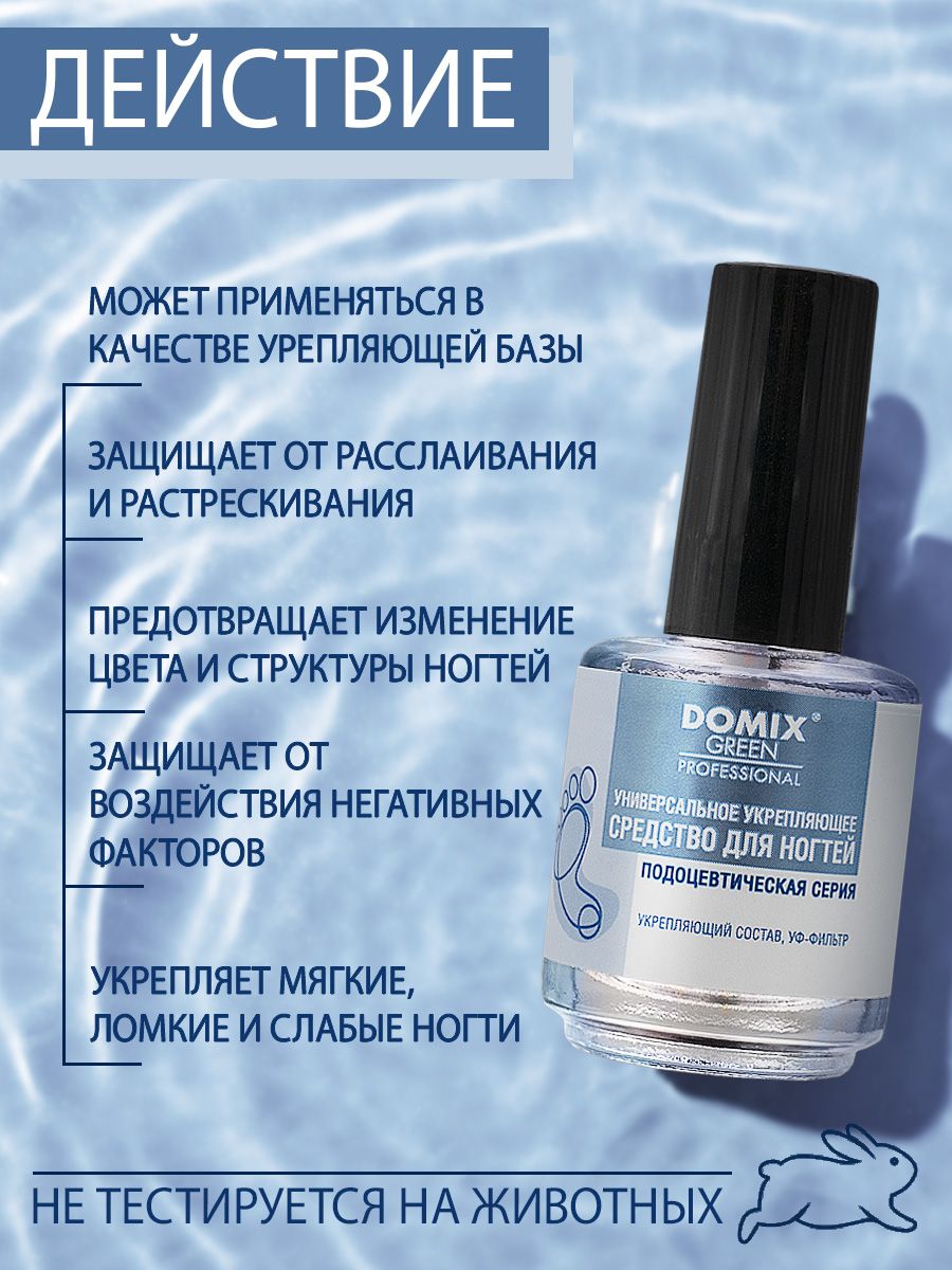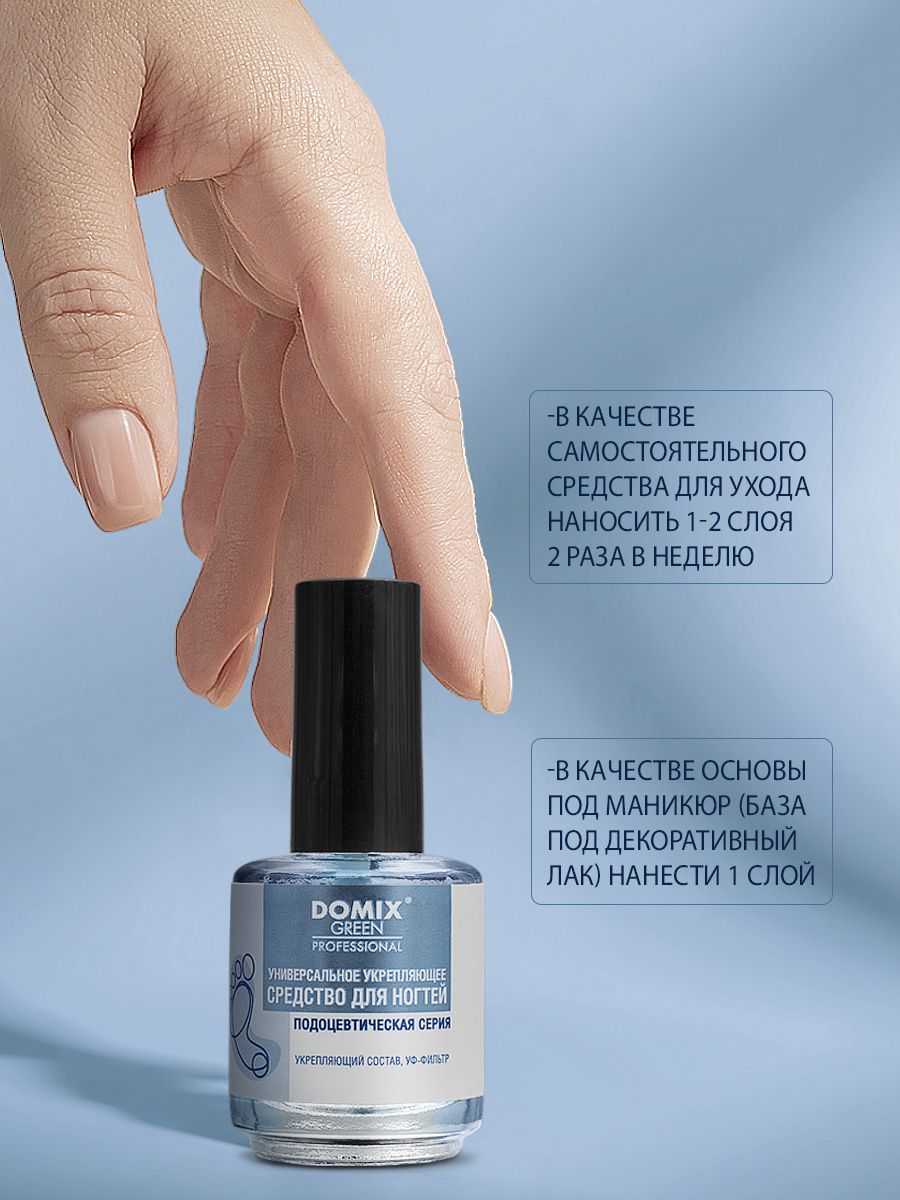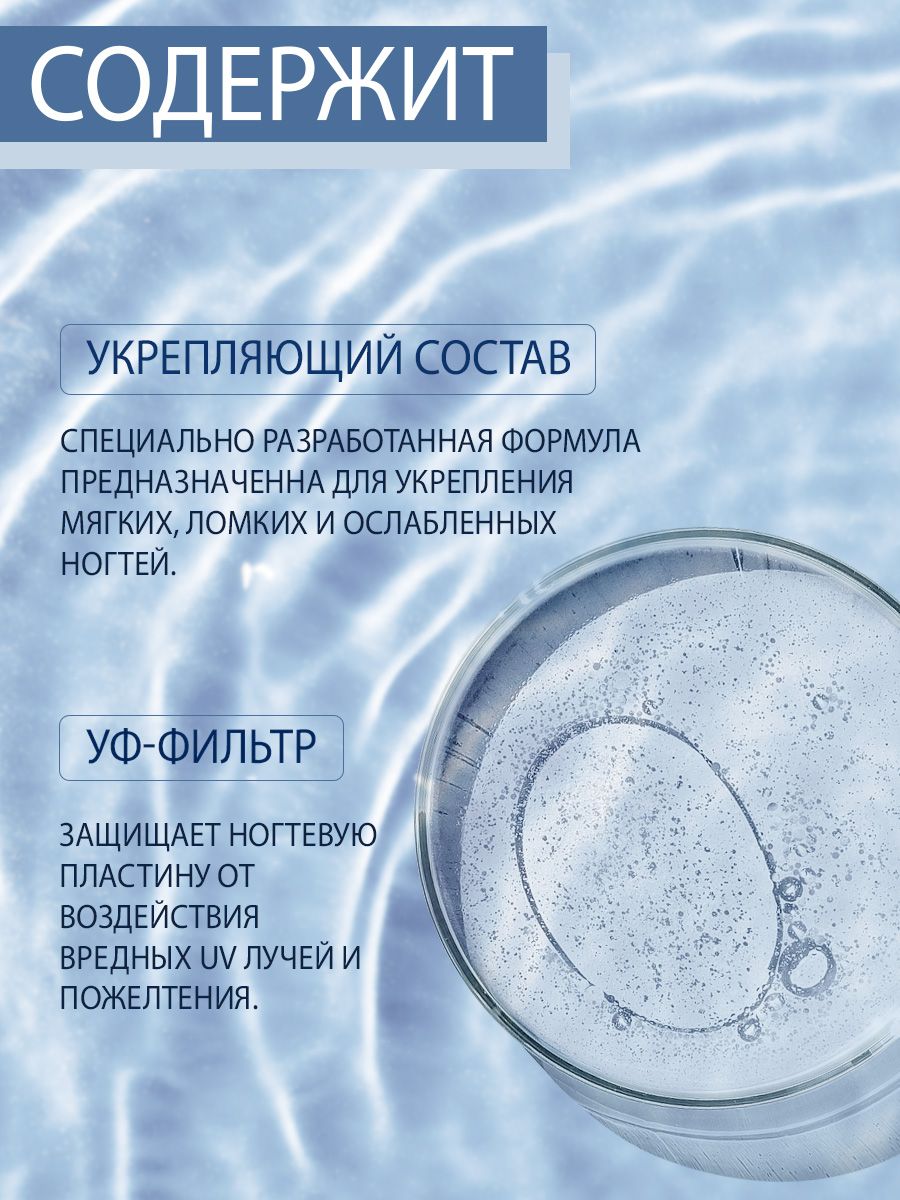 Средство укрепляет мягкие, ломкие и слабые ногти, защищает их от расслаивания и растрескивания, скрывает дефекты, предотвращает изменение цвета и структуры ногтей. Обеспечивает защиту от воздействия негативных внешних факторов. Может применяться в качестве укрепляющей базы под декоративное покрытие. В основе – запатентованные альдегиды, прошедшие медицинский контроль.