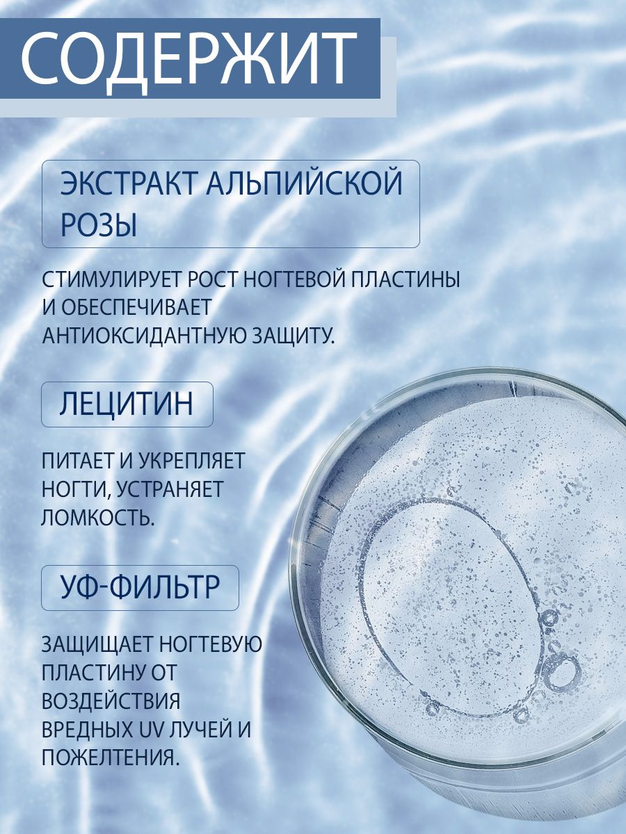 Средство предотвращает расслаивание ногтей, фиксирует отслоившиеся кромки и скрывает дефекты. Лецитин и экстракт альпийской розы питают и укрепляют ногти, устраняют ломкость, стимулируют рост и обеспечивают антиоксидантную защиту. В основе средства – запатентованные альдегиды, прошедшие медицинский контроль.