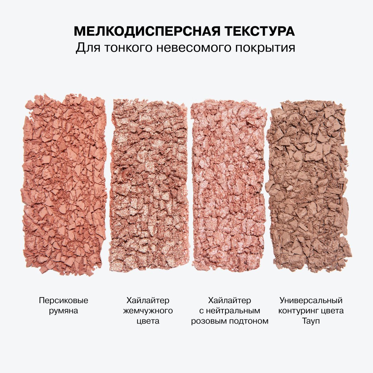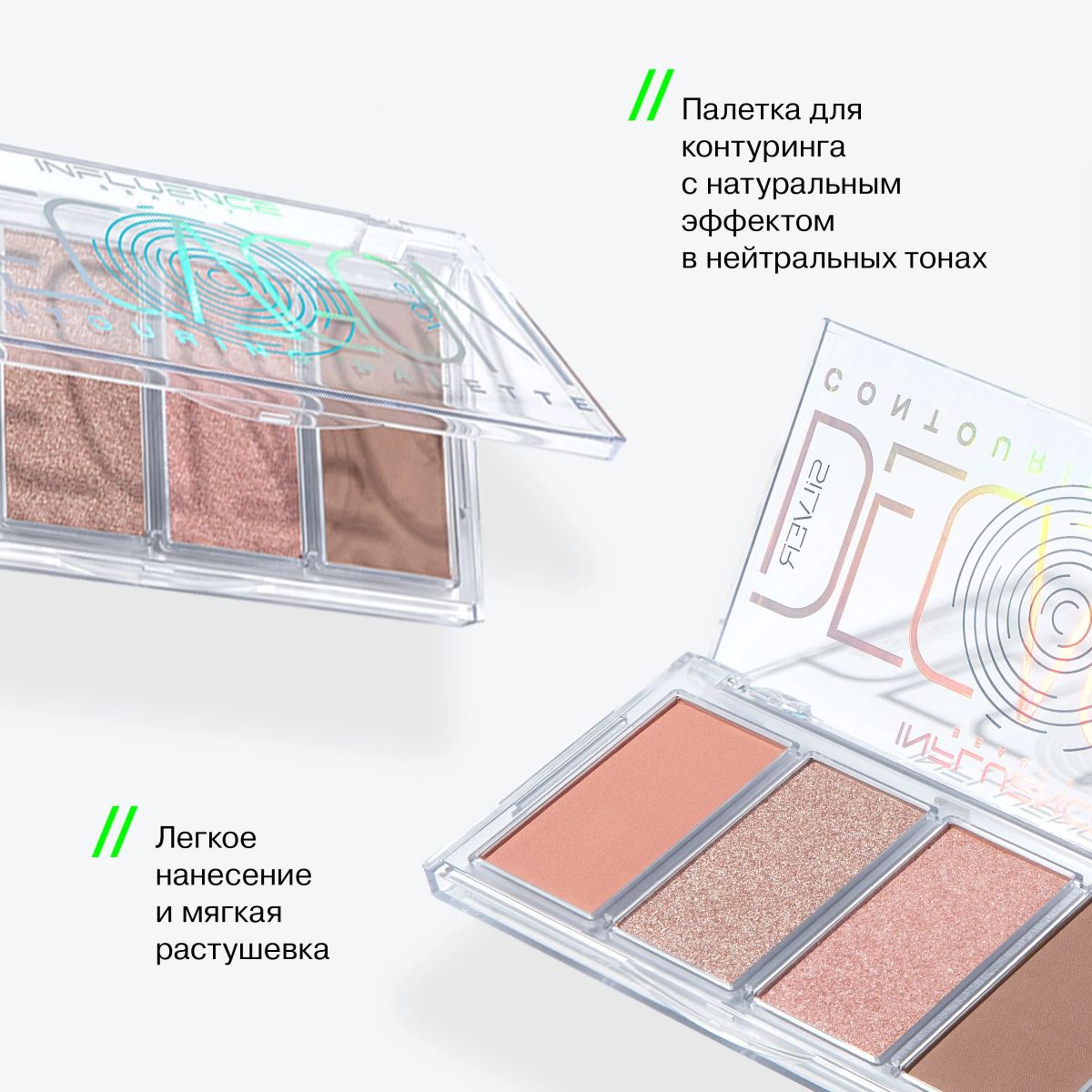 Способ нанесения: Наносите кистью. Используйте схему золотого сечения, расположенную на задней стороне палетки, для создания идеального макияжа лица.