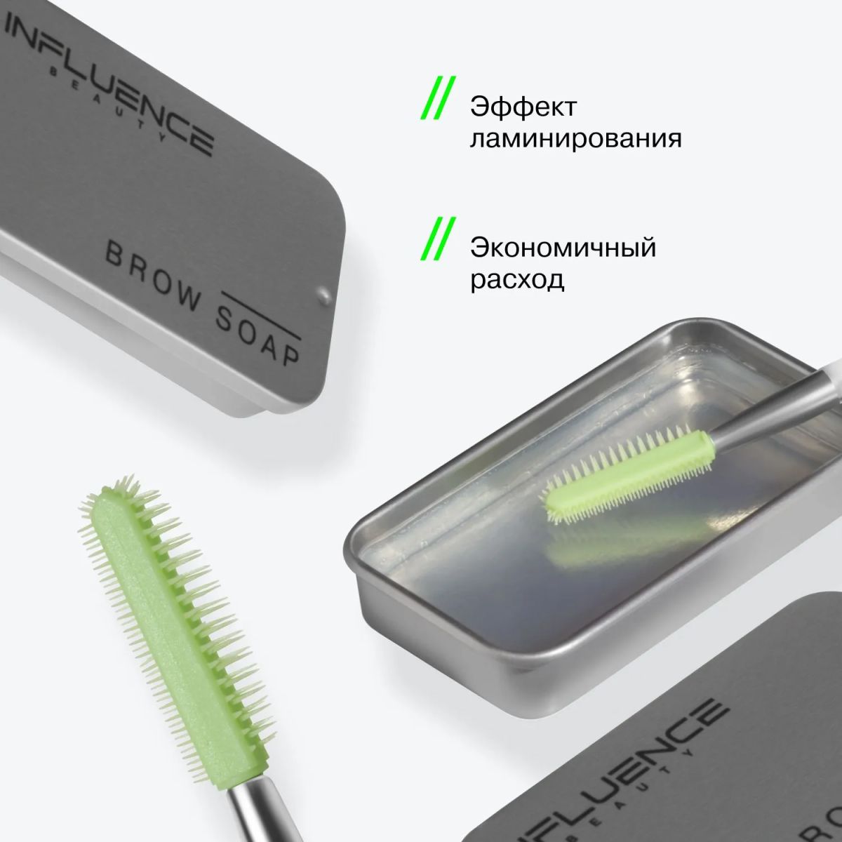 Способ нанесения: Нанесите средство с помощью силиконовой щеточки на брови, задавая направление и прижимая к коже.