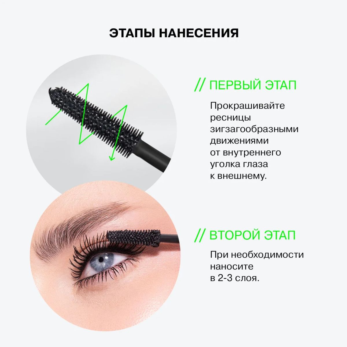 Способ нанесения: Прокрашивайте ресницы зигзагообразными движениями от внутреннего уголка глаза к внешнему. В конце дня смойте тушь теплой водой без дополнительных средств для демакияжа.