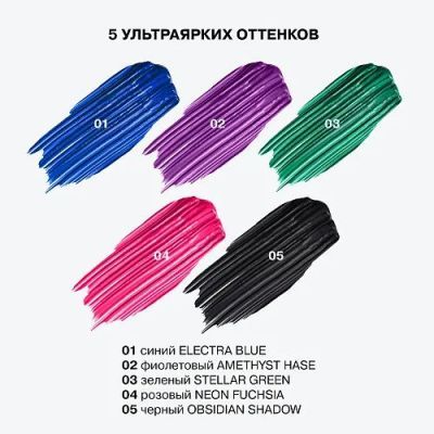 Ультраяркая тушь представлена в пяти насыщенных оттенках: синем, фиолетовом, зеленом, неоновом розовом и черном. С каждым из них ваш взгляд с объемными и длинными ресницами будет притягивать внимание.