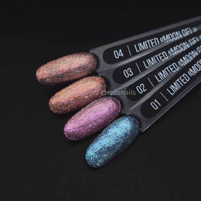 MOON GEL - шикарная коллекция гелей из 4 оттенков в прозрачной основе, наполненной мерцающими хлопьями, блёстками и шиммером.
