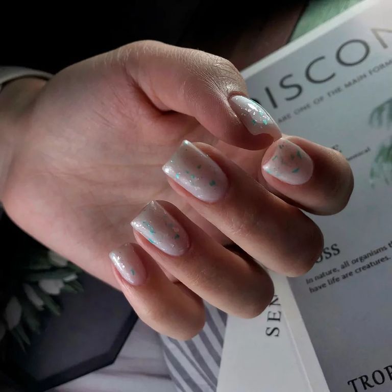 Гель-лак молочный, с зелёно-серебряной поталью, полупрозрачный