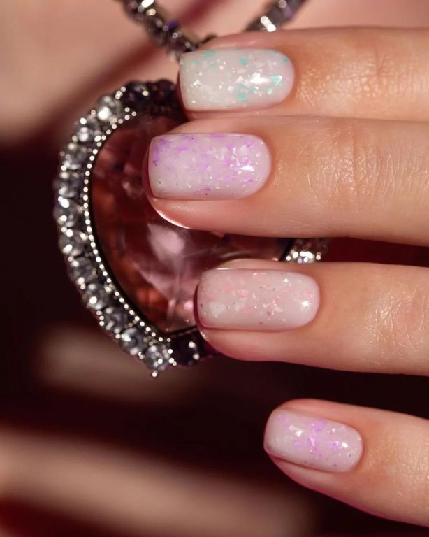 Гель-лак молочный, с фиолетово-серебряной поталью, полупрозрачный