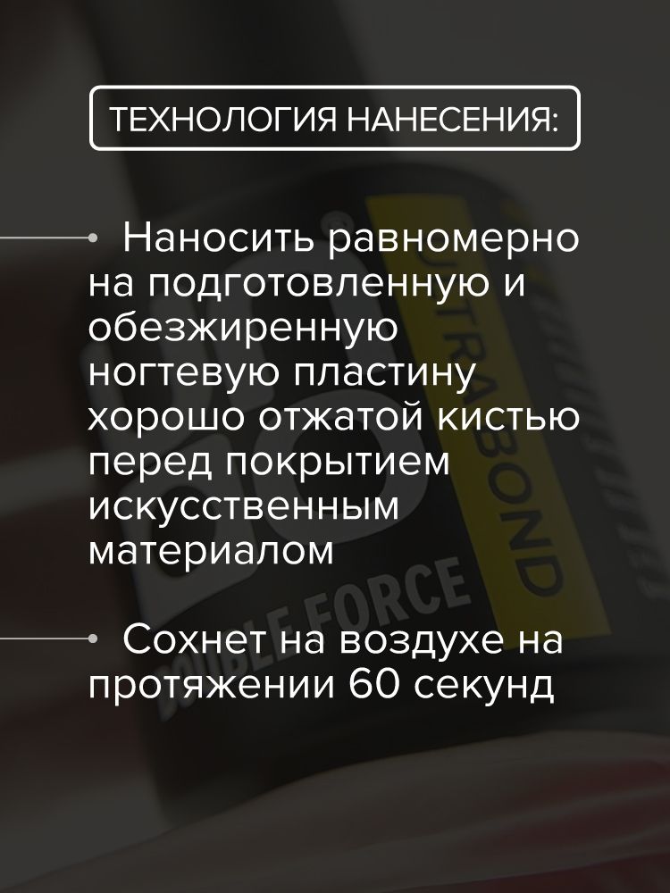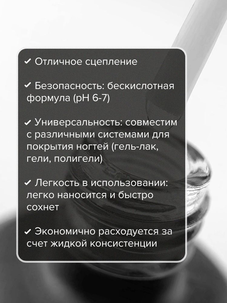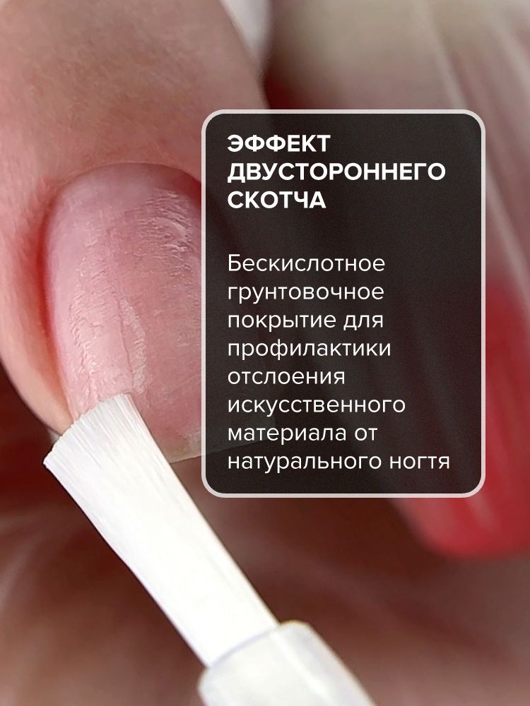 Остаточная липкость (дисперсия) средства обеспечивает надежную адгезию, создает эффект «двустороннего скотча» между ногтевой пластиной и искусственным покрытием, что значительно увеличивает срок носки любого материала.