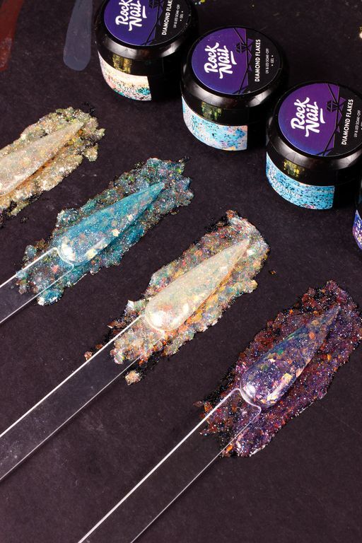 • Шикарный эффект бриллиантовых хлопьев любой однотон превратит в роскошный нейл-образ.