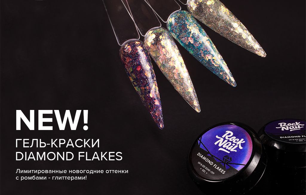 • Гель-краски без липкого слоя Diamond Flakes удобно наносить и использовать в дизайнах. Градиенты, рисунки, акценты — тебе под силу всё!