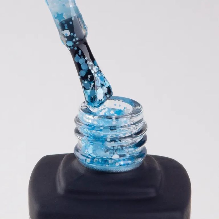 Этот прозрачный оттенок, наполненный россыпью голубого и белого глиттера в виде звезд и шестиугольников, вдохновлен лунным Морем Облаков. С ним так легко исполнять мечты клиентов и дарить волшебный маникюр!