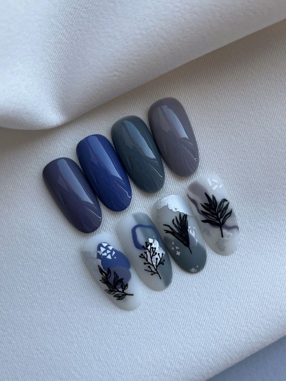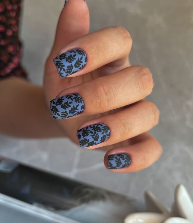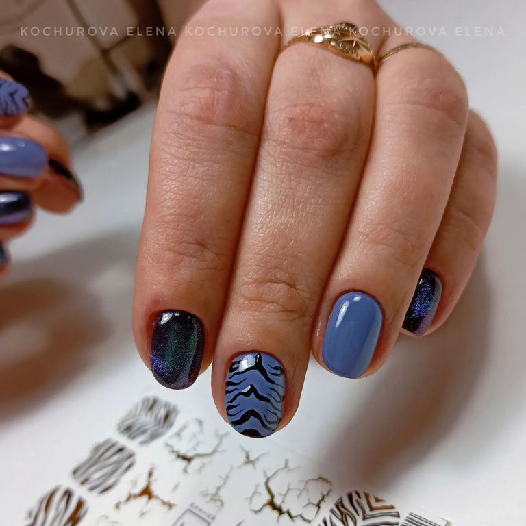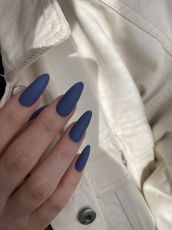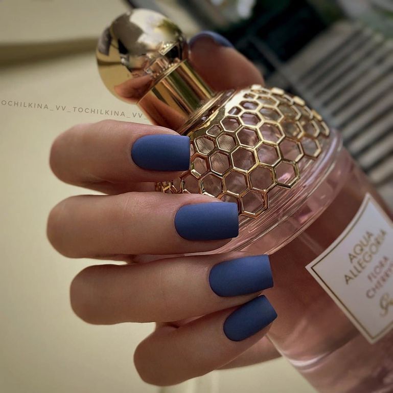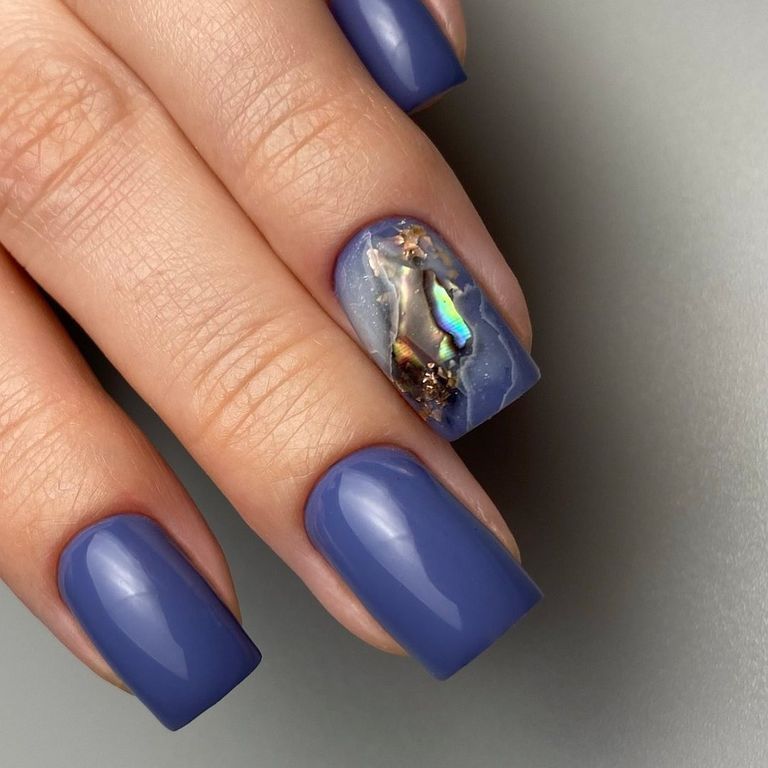 Гель-лак синего оттенка с нотками фиолета, без эффекта, плотный.
