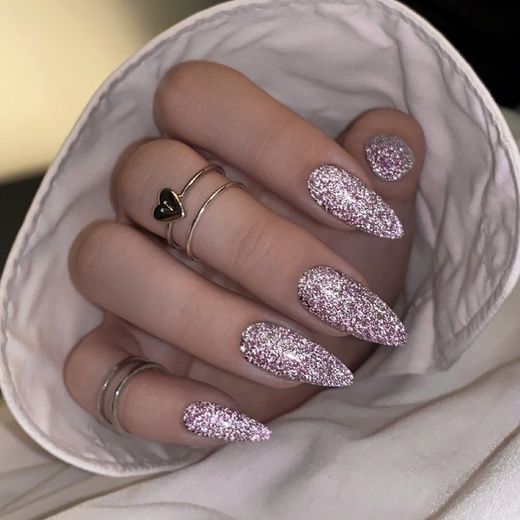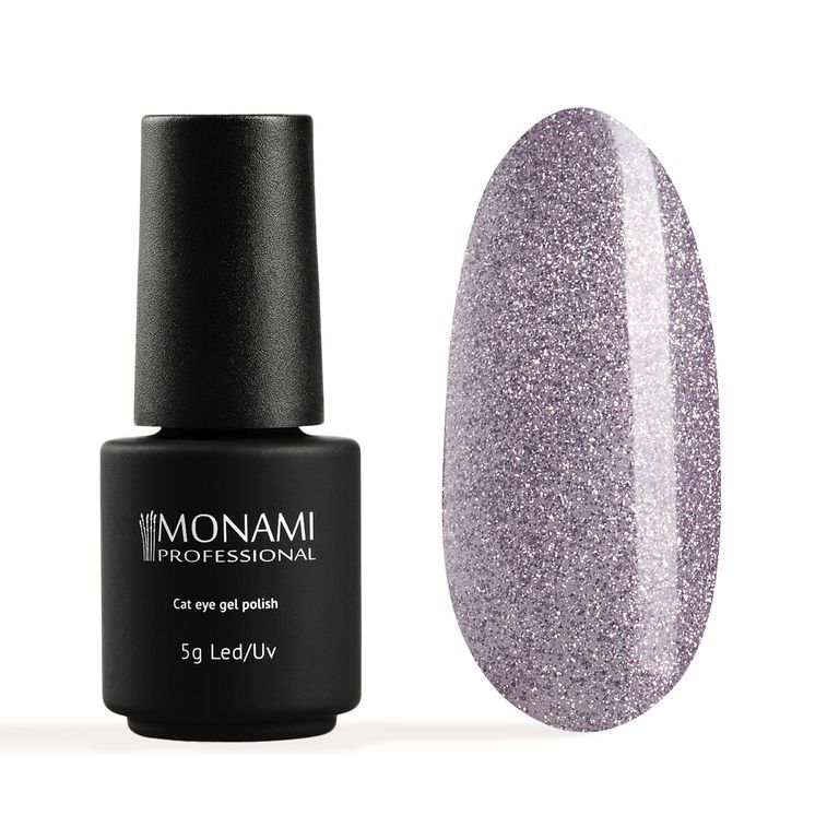 Гель-лак сиреневого оттенка с эффектом "Кошачий глаз" и светоотражающими частицами.