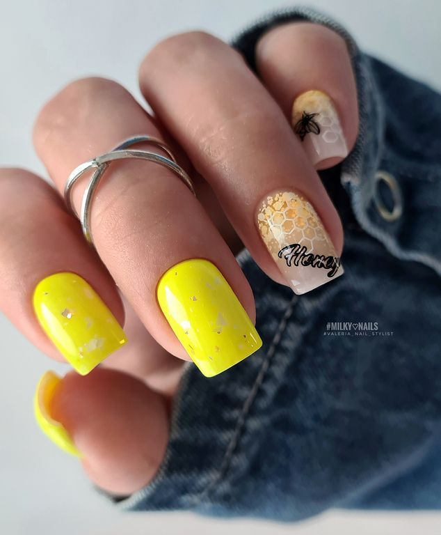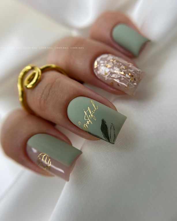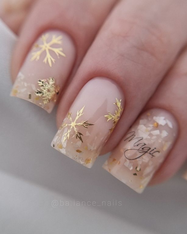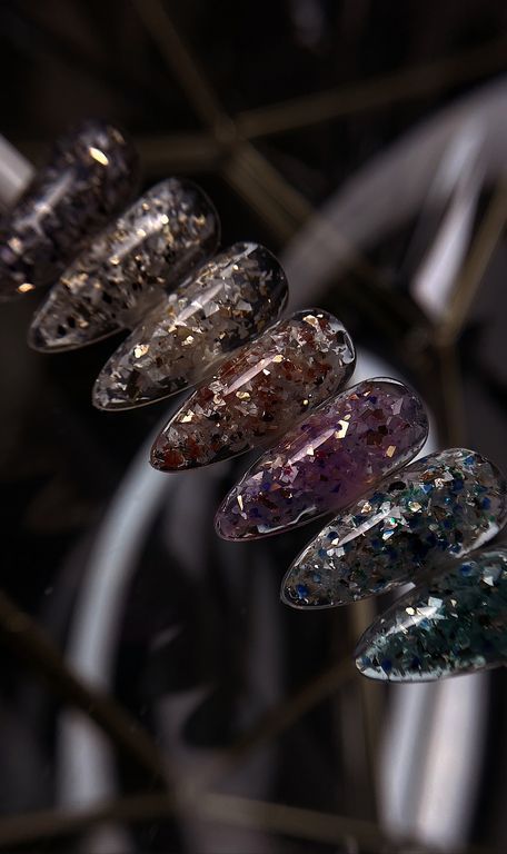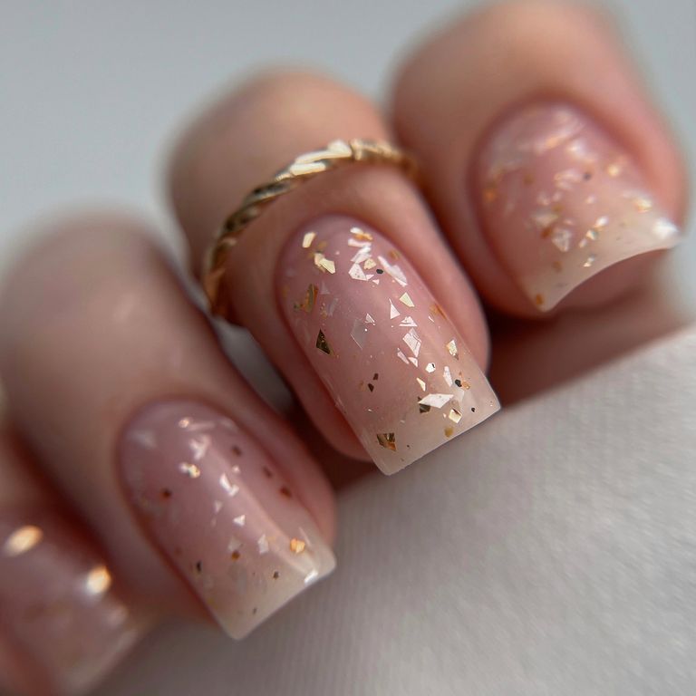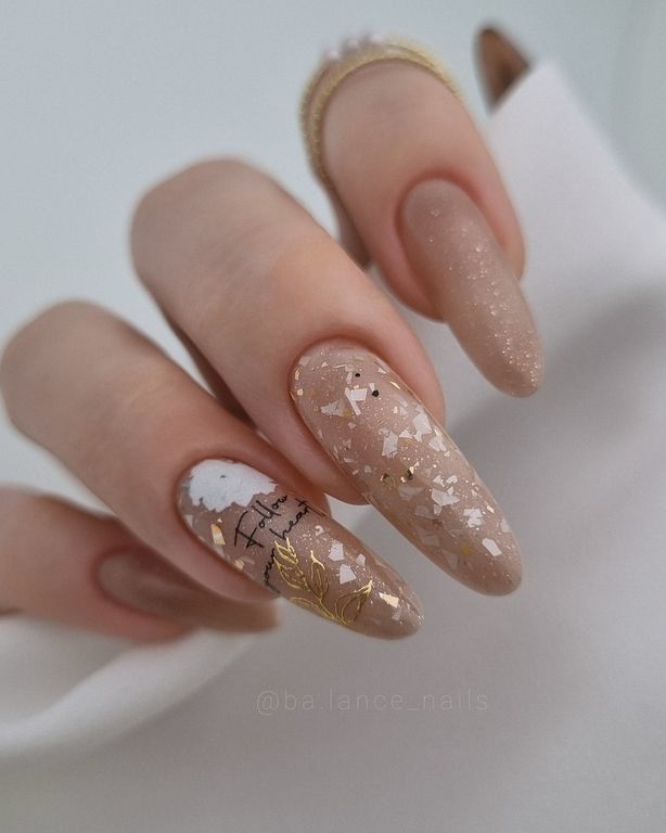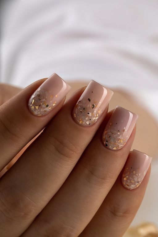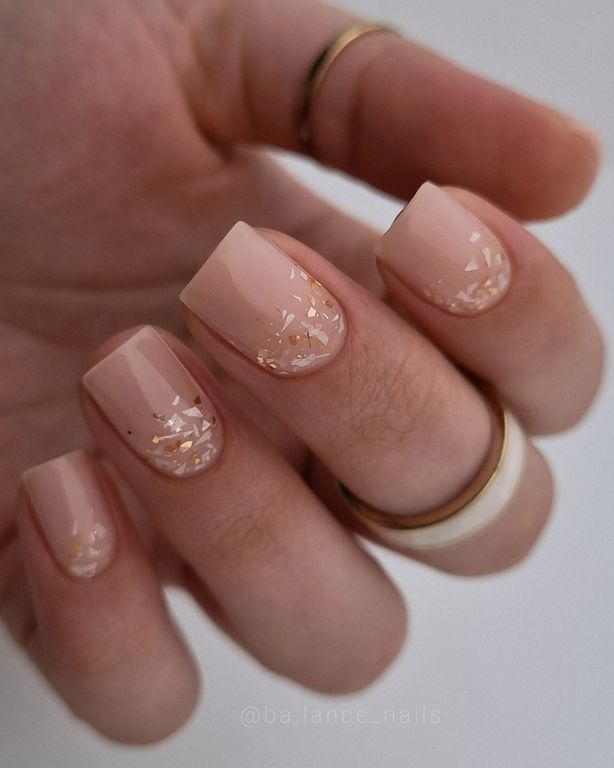 Гель-лак c нежно-бежевыми блёстками на прозрачной основе.