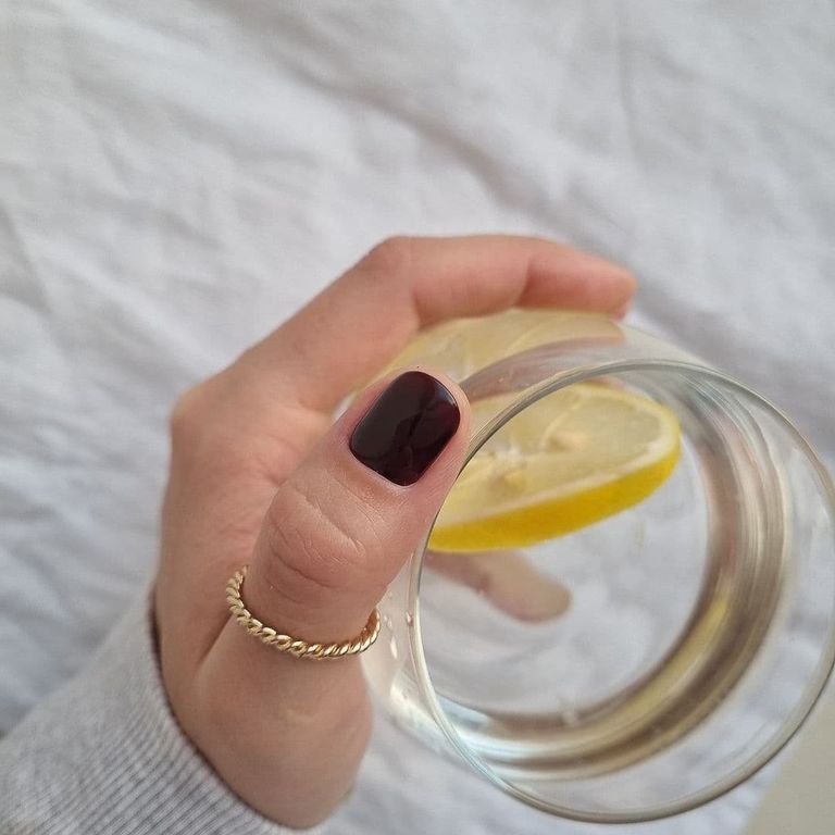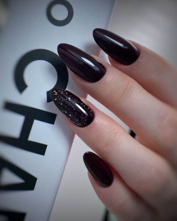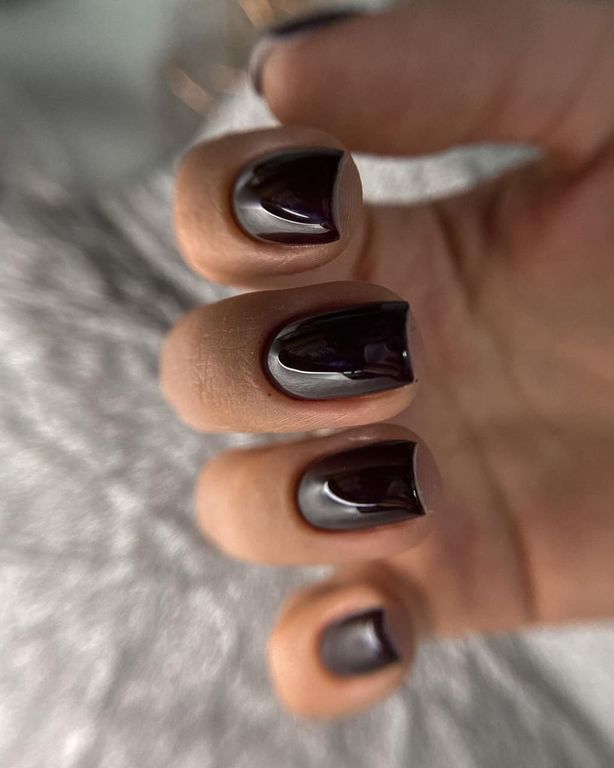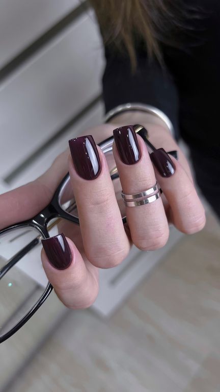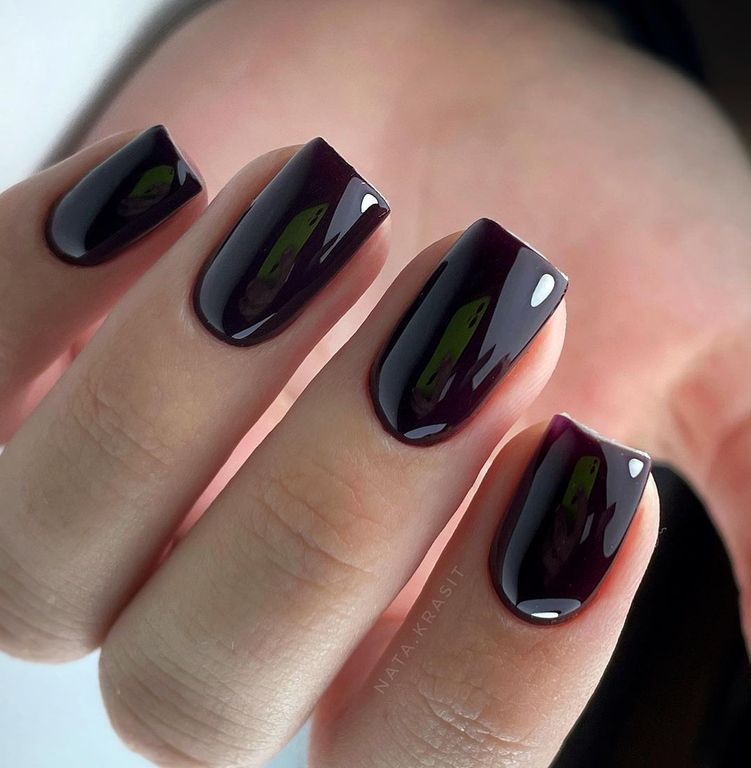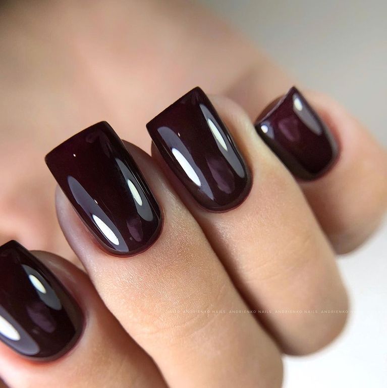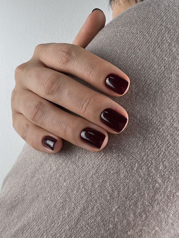Гель-лак тёмно-бордового оттенка с фиолетовым отливом, без эффекта, плотный.