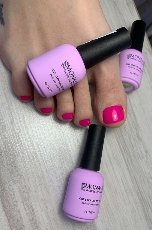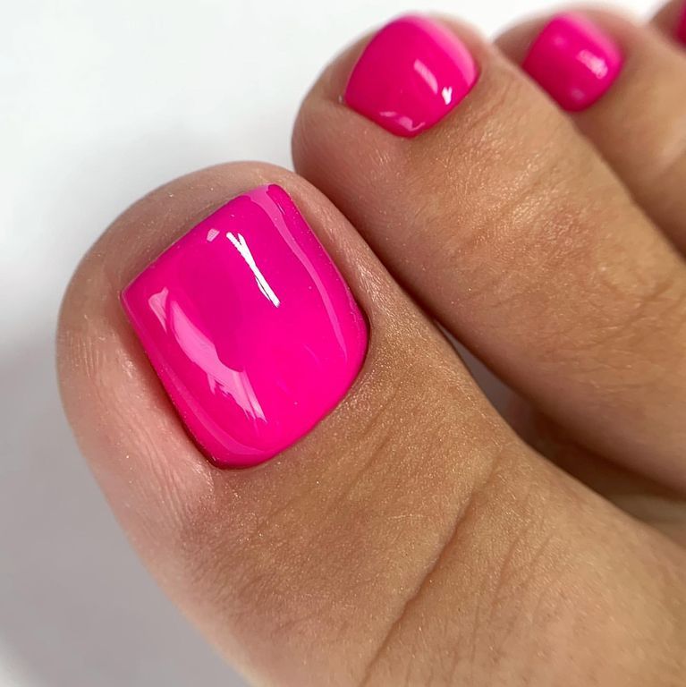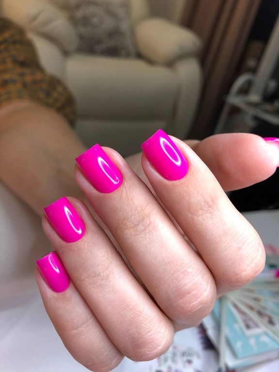 Гель-лак ярко-розового оттенка, без эффектов, плотный.