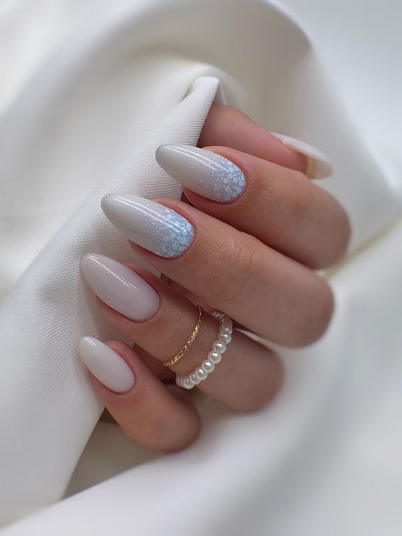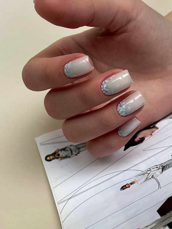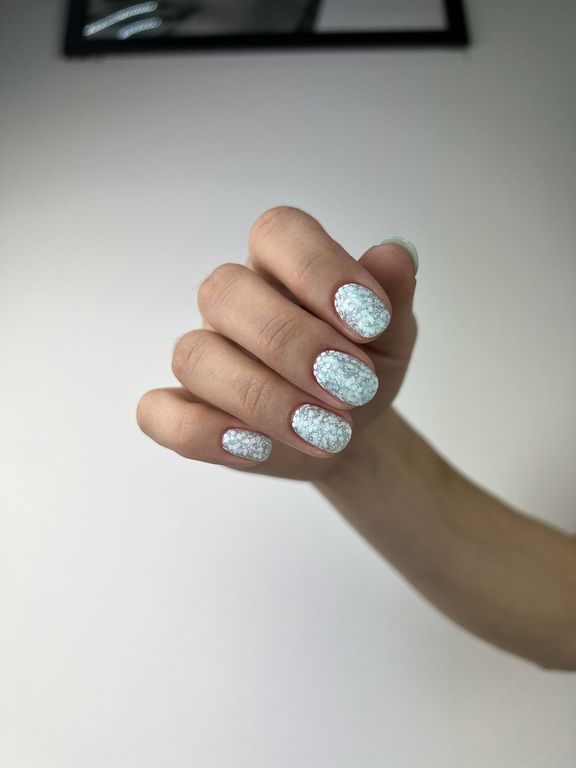 Гель-лак светло-голубого оттенка c утопленными белыми шестигранниками разных размеров.
