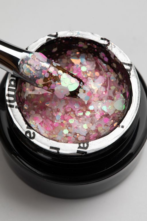 Фигурки удобно распределять для дизайна или покрывать ими ногтевую пластину полностью, выбирая нужный вид блёсток. Лёгкий витражный подтон в цвет голографических частиц понравится любителям аквариумных дизайнов.