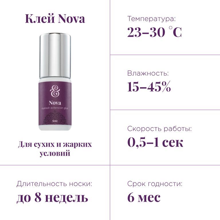 Средняя эластичность и жидкая консистенция удобны в работе, клей не растекается, расходуется экономно. В составе более безопасный цианоакрилат, что позволило снизить испарения. ENIGMA NOVA надежный и стойкий клей обеспечивает носку ресниц до 8 недель.