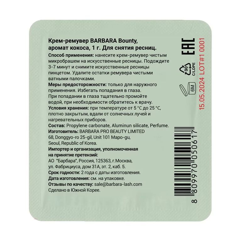 Способ применения: используя микробраш, аккуратно нанесите кремовый ремувер на место склейки натуральных и наращенных ресниц. Подождите 3-10 минут. Удалите наращенные ресницы. Тщательно уберите остатки ремувера с ресниц чистыми ватными палочками.