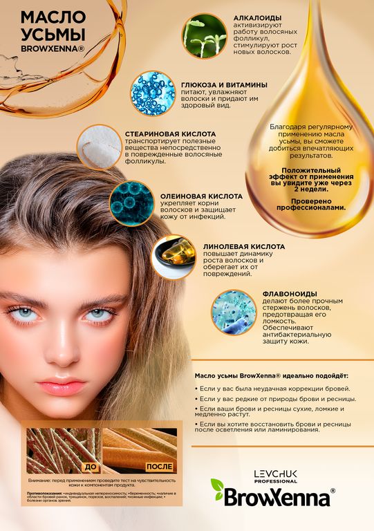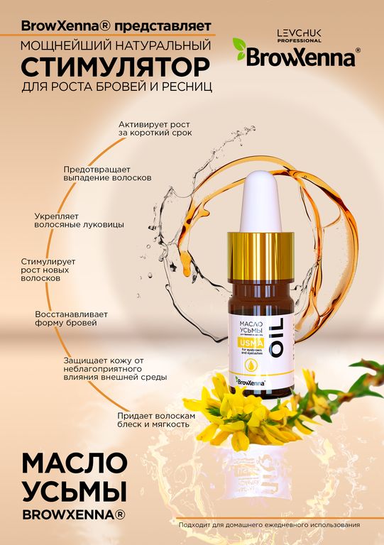 Для бровей: Нанесите небольшое количество масла с помощью щеточки массажными движениями на сухие брови по направлению роста волосков.