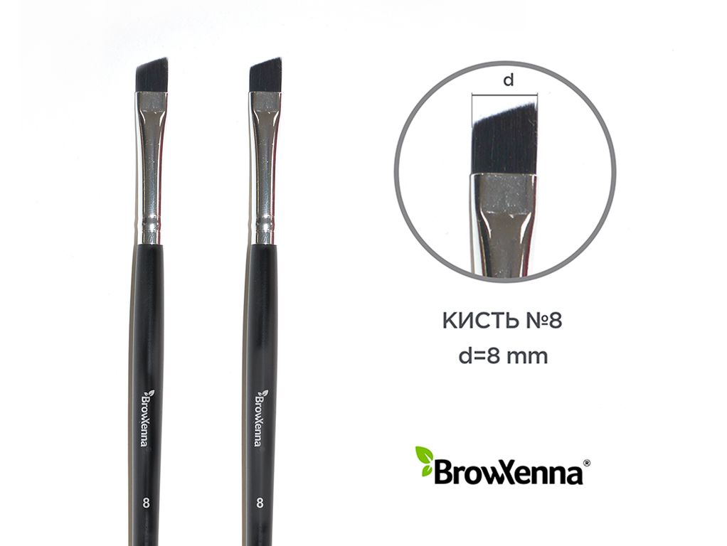 Набор кистей №8 BrowXenna® (скошенные) — скошенная кисть с упругим искусственным ворсом, подойдет для окрашивания хной нешироких бровей. Ворс мягкий и пластичный. Подходит для прорисовки точных графичных линий и тонких волосков. С кистью удобно работать, как профессионалу, так и начинающему мастеру-бровисту.