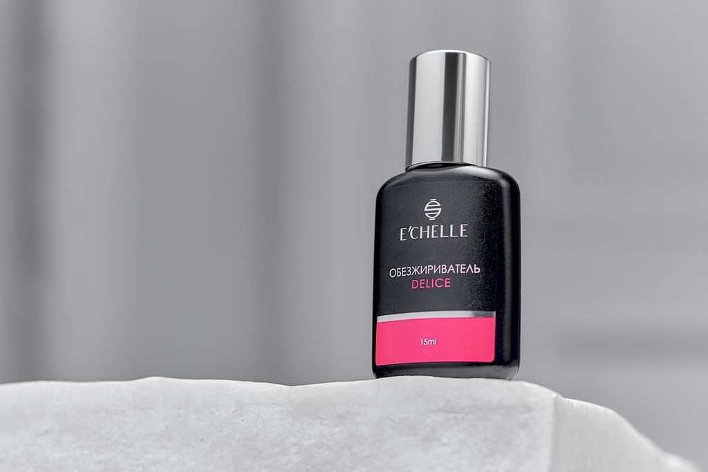 Мягкий гипоаллергенный обезжириватель E'CHELLE DELICE используется для идеальной и быстрой подготовки натуральных ресниц к наращиванию.