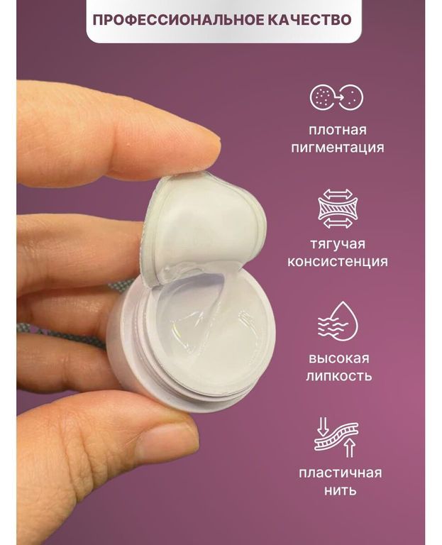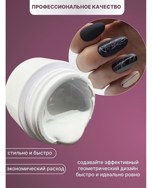 Высокая липкость геля обеспечивает прочное прилипание к ногтям, а пластичная нить позволяет легко формировать геометрические фигуры и рисунки.