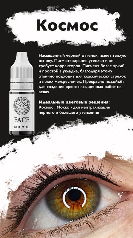 Пигмент яркий и простой в укладке. Рекомендуем использовать Космос для яркой межреснички и классических стрелок.