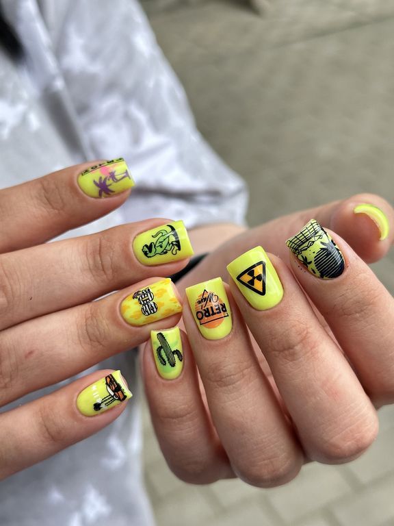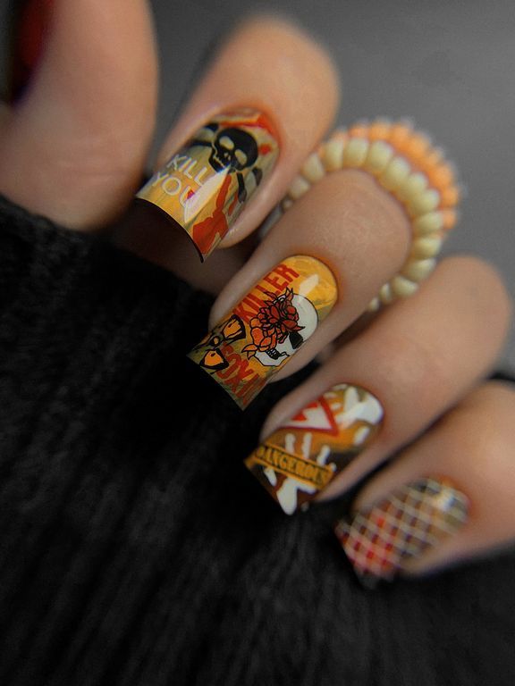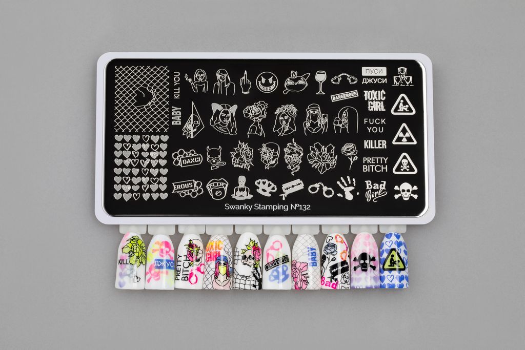 Пластина – вызов, для смелых, заявляющих о себе девушках. Популярный паттерн сетка, надписи изображения девушек, черепа в цветах все арты прекрасно сочетаются между собой создавая каждый раз уникальную композицию на ногтях.