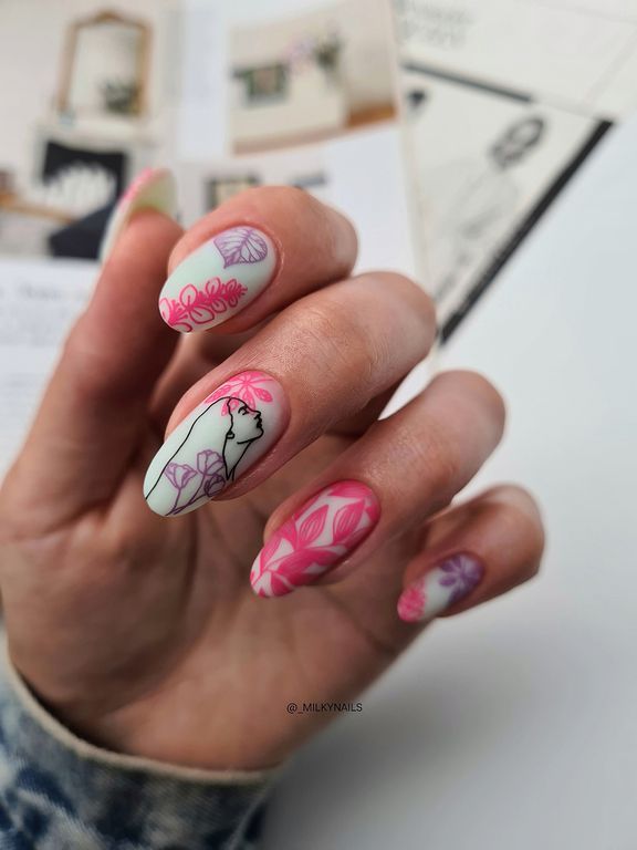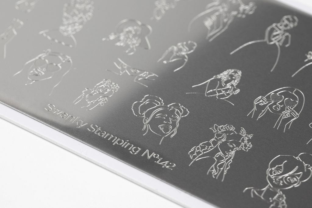 Пластина 142 — совместная работа с талантливой @alexandra_nail_design. Нежная, наполненная, одиночными рисунками силуэтов девушек, имеющий тонкий и мечтающий характер. Дизайн прекрасно подойдет для техники реверсивного стемпинга. Все элементы можно разукрасить в любой цвет и украсить маникюр утонченной, романтичной натуры