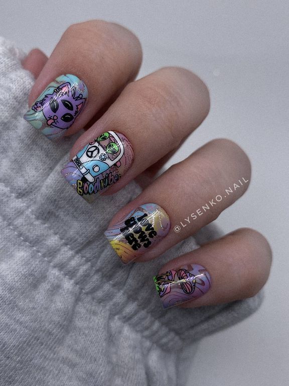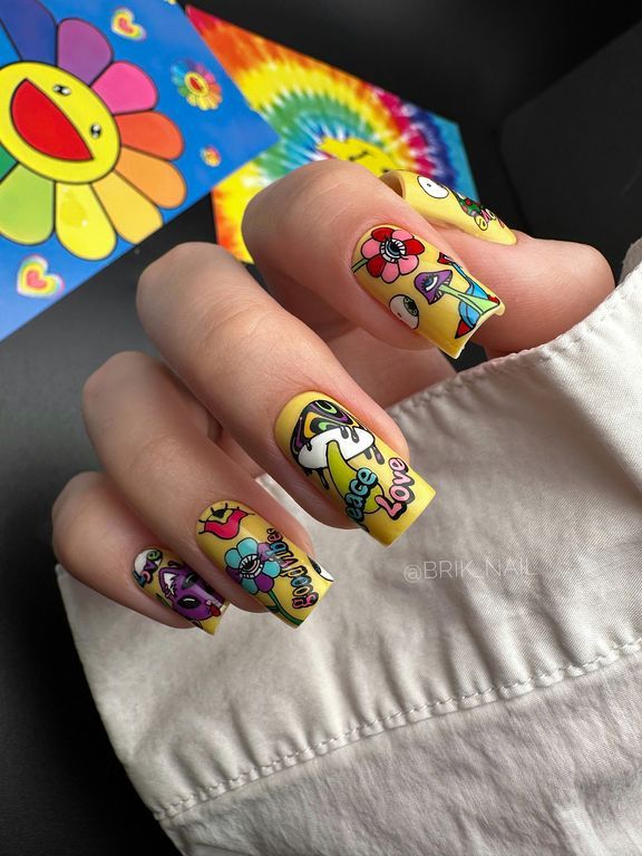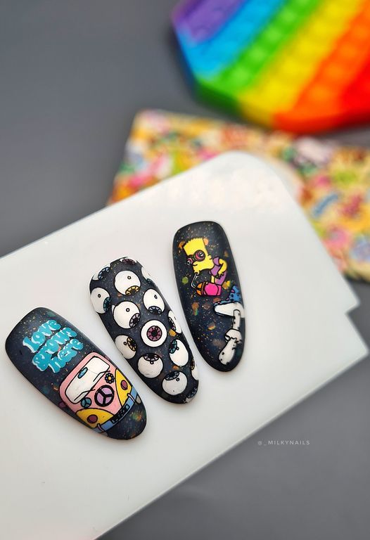 Смелые арты, которые прекрасно сочетаются между собой создавая каждый раз уникальную композицию на ногтях.