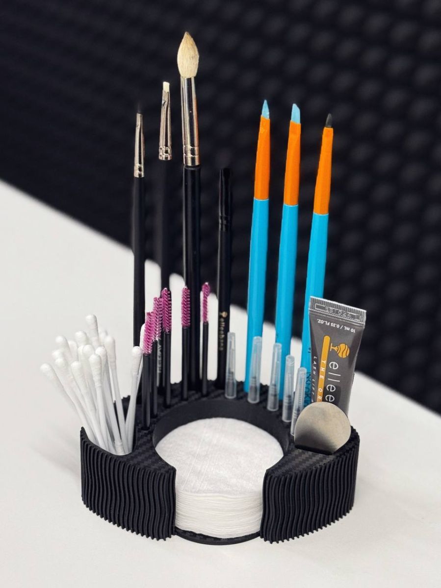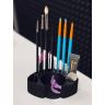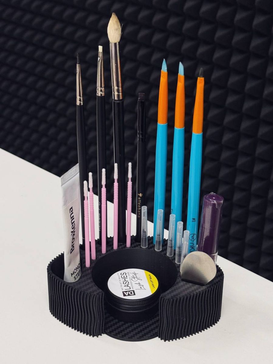 Смотрим слева направо - отверстие в которое можно вставить краску для лами/составы, ватные палочки внутренний контур имеет отверстия в которые влезут - микробраши, бейбибраши и щеточки. - внешний контур для кистей - есть отверстие для жидкого клея - отверстие для аппликатора и плоская площадка - туда можно кинуть гелевый клей, составы в Саше, оксид, линейку для ресниц или использованные валики/оболочки - чтобы не пачкать кушетку, ватные диски