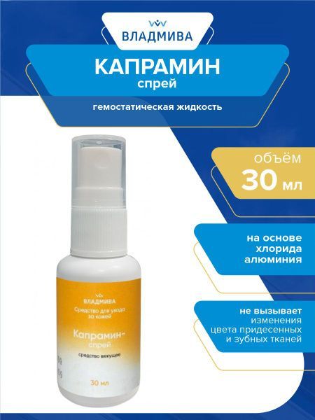 Капрамин спрей гемостатическая жидкость на основе хлорида алюминия 30мл Производитель: АО "ОЭЗ "ВладМиВа" Страна: Россия